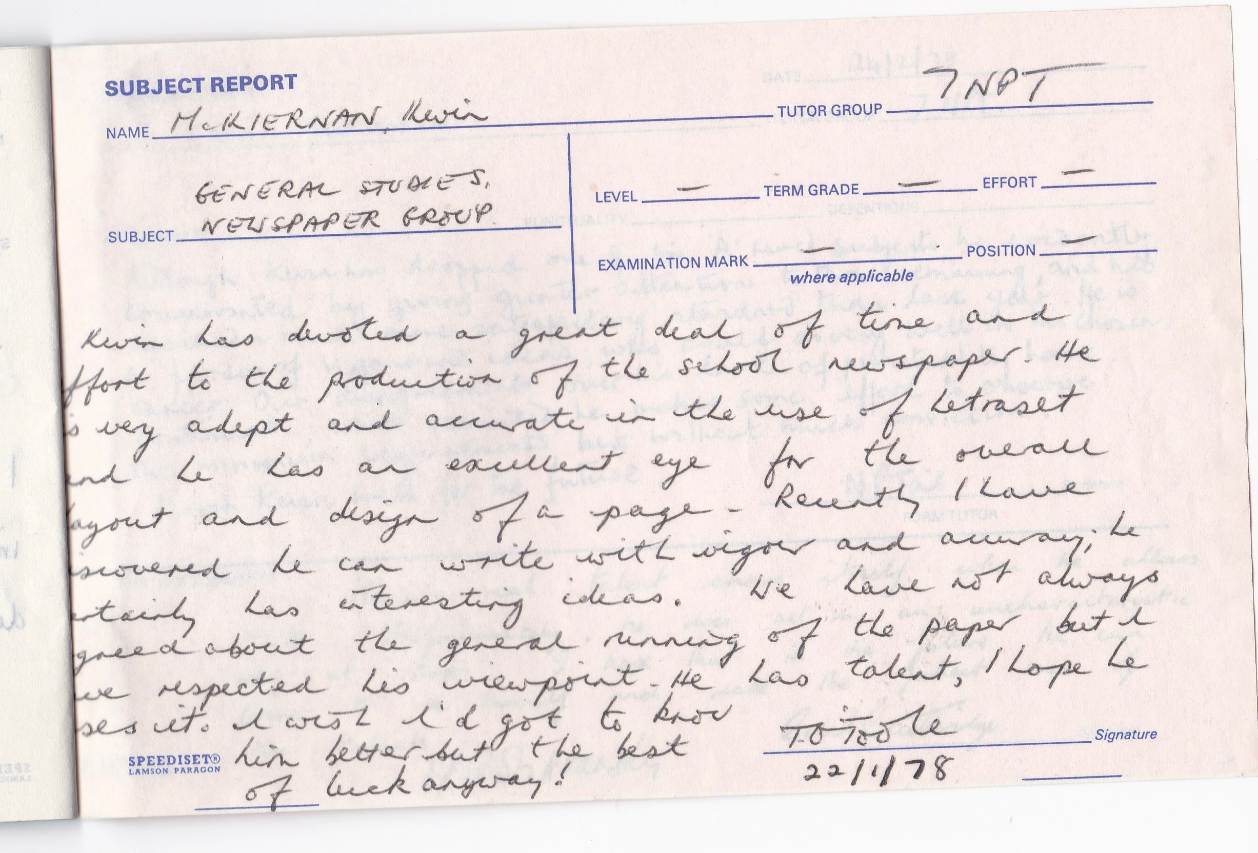 I was good at Letraset, apparently. But the bit that cut me was: “he can write with vigour and accuracy; he certainly has interesting ideas”. I held that in my bleeding heart for years. Terry ‘Toots’ O’Toole wasn’t my teacher, we’d didn’t know each other, we’d never met until I worked on the paper in my last year. He was the editor and Head of English. I didn’t study English. But that one line in that very shitty report meant the world to me. I’m eight years older now than Toots was when he died (too young) but it’s only now - 45 years after he wrote it - that I’m prepared to listen to him.